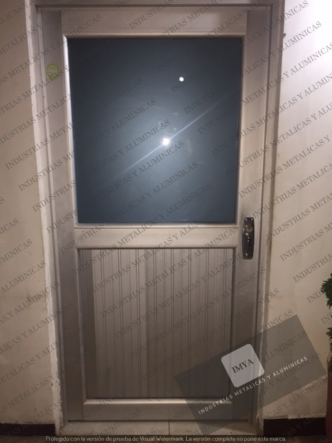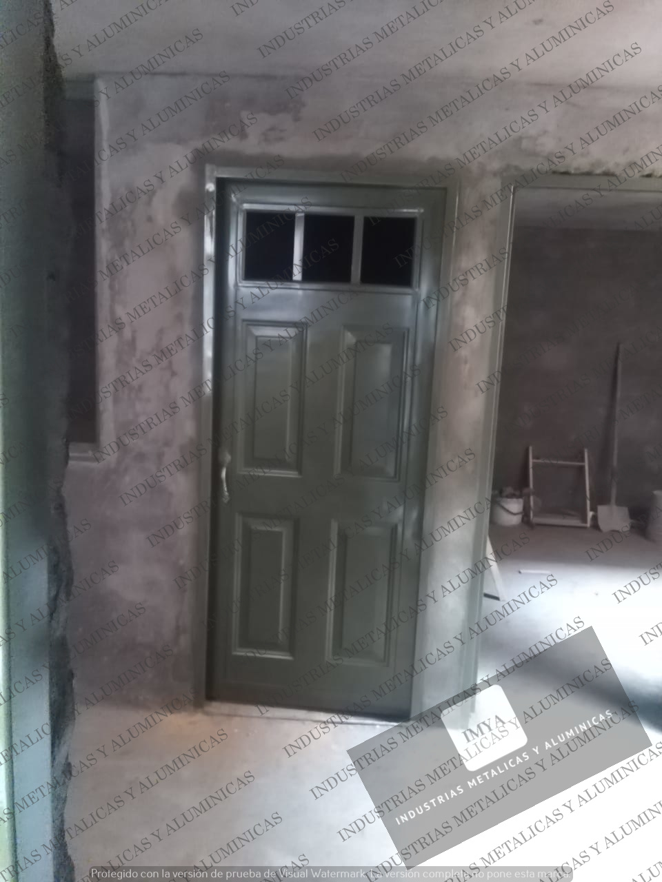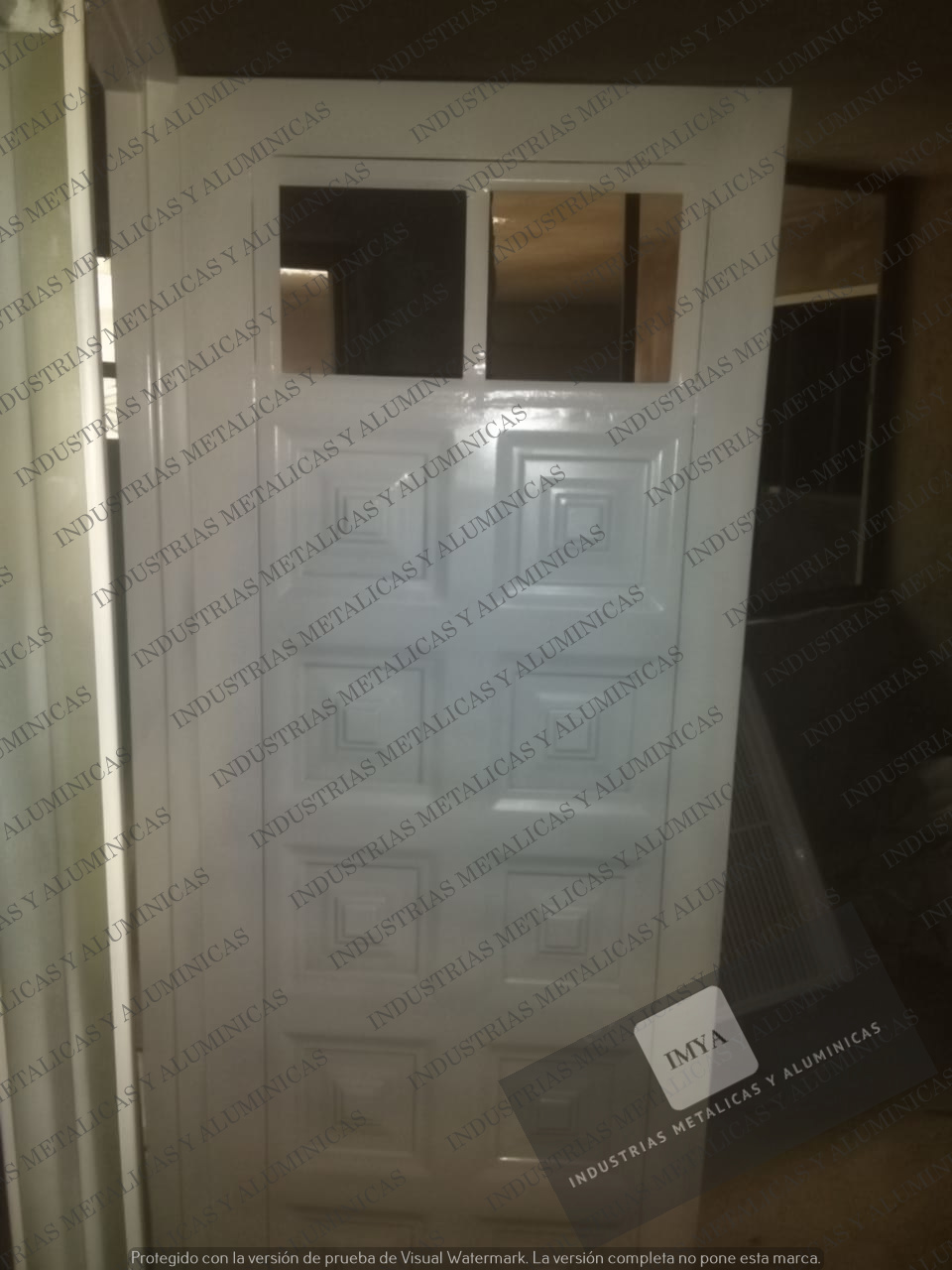 Puerta con ventanal y dibujo troquelado en medio tablero.